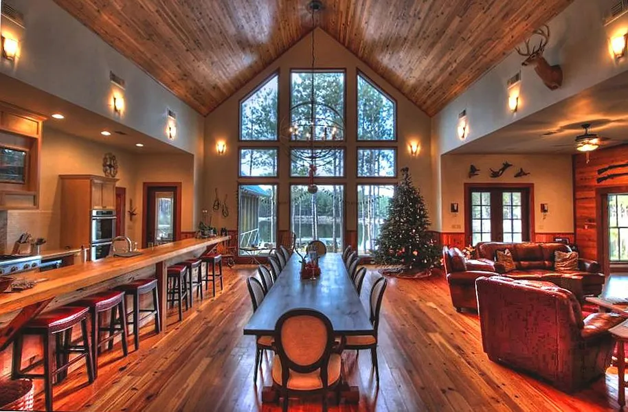 Lodging: Completely custom 6,000 sq/ft lodge situated on a peninsula overlooking a 10 acre private lake. Home features 2 master suites in the main house with a 4ba/4ba bunk hou...