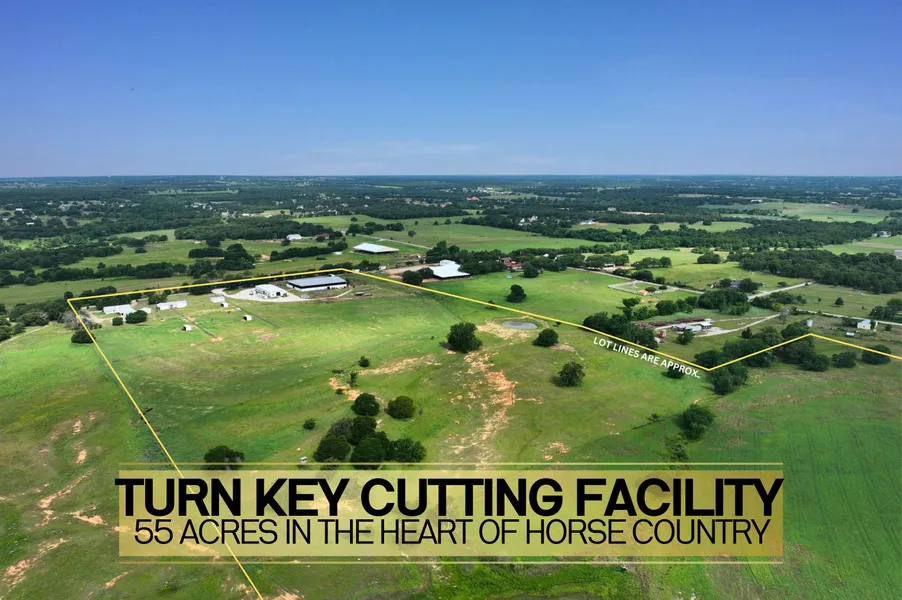Turn Key Horse Cutting Facility just 35 minutes from Fort Worth! The main home exudes character with spacious rooms and exquisite woodwork. New windows and spray foam encapsulation. Step outside to discover an oasis with an inground pool, spa, and a flagstone patio overlooking the picturesque pasture. Numerous detached garages and shops, along with a charming craft barn, provide ample storage options. The 135' x 50' Horse barn boasts 16 spacious stalls, oversized roll up doors, a complete fly spray system, and a separate wash area. A detached guest suite offers 2 additional bedrooms and an open concept living and kitchen space. The highlight of this property is the extraordinary 150' x 120' indoor arena, equipped with horse traps, working pens, loading chutes and more. Fully fenced with a 45-acre hay field, (4) Lean to's, and Expansive ponds. This ranch is a haven for horse enthusiasts