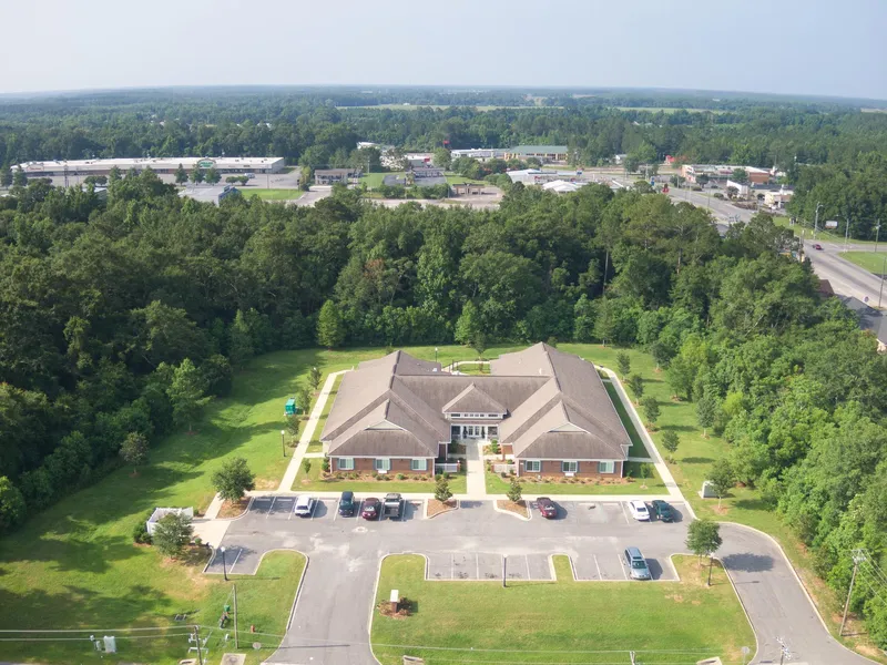 The community layout is a one-story assisted living residence with entry located on the north side of the improvements. From above, the building has an "H" shape design with 2 parallel hallways connected by a central common area. The central common area includes the main dining room, sitting area with a large fireplace, kitchen, offices, and activity areas. Resident halls are identical with 12 units lining either side of each unit. At the rear of the community is a covered patio and courtyard with a woodland view. The site is comprised of two parcels, is irregular in shape and its terrain is level. Characteristics include 330 ft of road frontage on McRae St which is a 2-way paved road, paved drives, walkways, landscaping, and site signage.