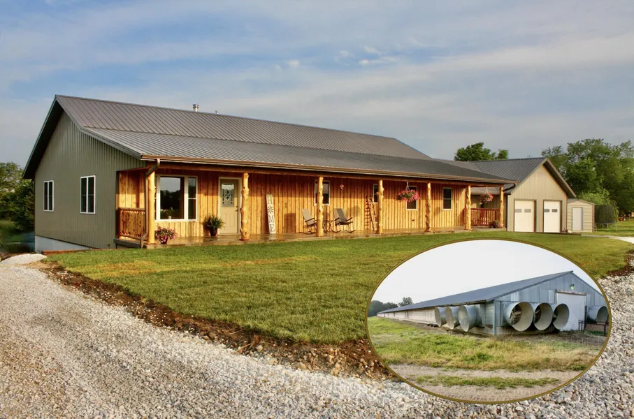 PRICE REDUCED!! Whitetail Properties is honored to present to you this outstanding ROI turn-key turkey production farm with the added bonus of a beautiful new home and Class 2 and 3 tillable soils. The current owners are under contract with Cargill and have achieved an AVNA (All Vegetable No Antibiotic) certification which translates to an additional $10,000 in realized income per flock. Please note: this status does not transfer with sale, new owners will be required to earn the above-stated certification. The current yearly income on 2.2 flocks is $135,000.00, which does not include the additional Avian free status bonus. Income is also supplemented by the sale of litter. The gorgeous new home is approximately 4,600 finished square feet with 2300 sq/ft. on the ground level and 2300 sq/ft. in the walk-out basement level. Craftsmanship abounds throughout, from the live cedar posts on the porch and interior ceiling beams to the custom hickory cabinets in the kitchen and bathrooms. The main level includes a spacious open concept living/dining/kitchen area, large pantry, master bedroom, full bath, second bedroom, office, and utility room. The finished basement includes a large family room, mini-kitchen work area, 4 bedrooms, and 4 full baths. The 2-car garage is attached. The water heater and cook stove are electric. The furnace is a duel system heat pump with propane override. A gas valve hook-up for a grill is located on the front exterior wall. Basement walls are constructed with highly energy-efficient ICF forms. The property also includes a 2 on a side walk-through dairy barn, which is currently being used to milk 25 cows, various holding pens, and a shade barn. The open ground is currently being utilized as pasture but is composed of Class 2 and 3 tillable soils which opens up an avenue to additional income. There are approximately 13 acres of timber, which can be hunted and a pond. This is a fantastic property that lends itself to multiple avenues of income potential! Please see the details below. If you have any questions or would like to view the property please give the listing agent a call.