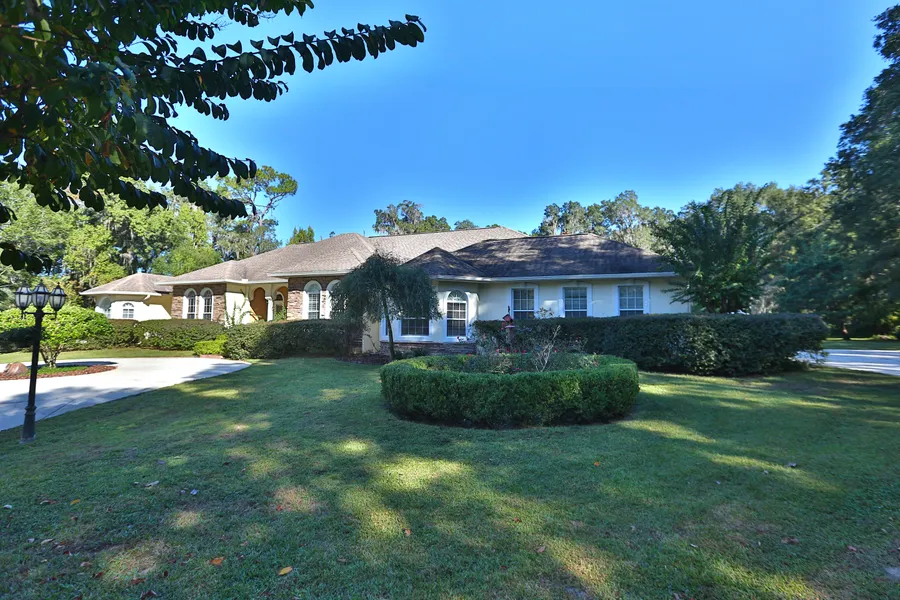 Gorgous home nestled on 5+/- acres in Turning Hawk Ranches. A gated community where horses are permitted and you have access to the Florida Greenways and Trails for riding, hiking, biking, and strolling for miles in the shade under Live Oak canopies. You are also close to the Florida Horse Park, WEC, and all the cities conveniences. The grand entry foyer opens to the expansive formal living room with gorgeous views of the property & dining room. Beautifully designed kitchen boasts custom maple cabinetry, an expansive island, eat-in-kitchen, the large windows allow for views of the property. Kitchen opens to the family room with Italian marble fireplace, coffered ceilings, lots of natural light and French doors that open onto the verandah, perfect for year-round gatherings. Spacious owners suite with luxurious bath and expansive closet. Office/study with built-in custom cabinetry. The the...