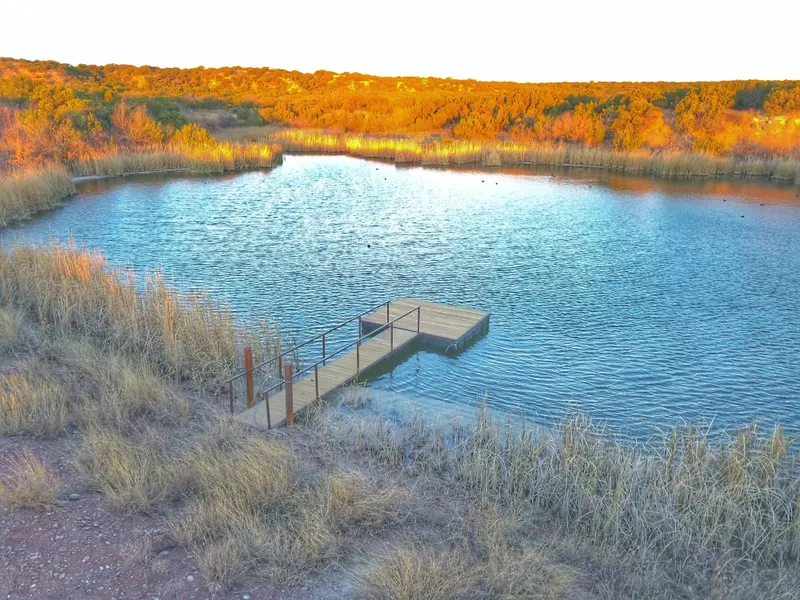 Terrain: The Copper Breaks Ranch is an excellent hunting and recreational ranch with terrain ranging from steep cedar ridges with huge elevation changes to scattered mesquite thickets, grassy flats, and hackberry draws. The tall grasses and brushy areas provide excellent quail habitat and cover for wildlife. It is common to find many elevation changes of 150+ feet while driving the interior road system. The high ridges and points offer excellent viewing of the wildlife trails below and premium blinds and feeders have been strategically placed throughout the ranch in areas of game travel. There are 3 ponds scattered throughout the ranch that provide easy access to water for wildlife or cattle. Two of these ponds are canyon impoundments with deep clear channels and have fishing docks that extend into the best fishing areas. In addition, Devils Creek runs through the center of the ranch giving the wildlife another water source and an excellent bedding area. Several food plots have been created in various areas of the ranch and stay covered in deer in the winter when planted in wheat. The owner has been implementing a strong protein and corn feeding program throughout the ranch and has certain feeder setups for different kinds of wildlife. It is also common to find mule deer on the property and especially in the rougher portions. Copper Breaks Ranch is surrounded by large ranches and the State Park. With the great diversification, location, and the variety of hunting and recreational activities to offer, it is very attractive for developing a fine corporate hunting ranch or family getaway.