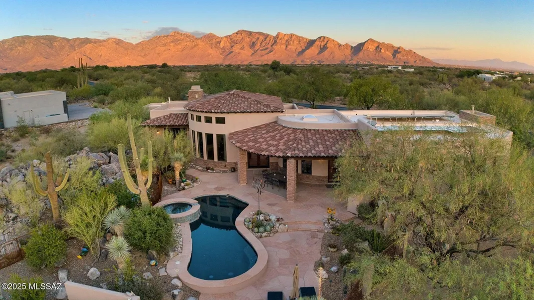 Experience luxury desert living in this beautiful 3-bedroom, 4-bath Tuscan estate in the exclusive Stone Canyon community. With over 4,200 sq. ft. of living space and a dedicated office, this home sits on a private 1-acre lot featuring owned solar, smart-home technology, and breathtaking mountain and sunset views. Enjoy high ceilings, natural stone floors, and large windows that fill the home with light. The gourmet kitchen opens to a spacious living and dining area with a wet bar and gas fireplace, perfect for entertaining. The primary suite offers dual vanities, a jetted tub, walk-in shower, and custom closet. Two additional en-suite bedrooms provide comfort and privacy for guests. Relax outdoors on the flagstone patio with an outdoor kitchen, pool and spa, and private putting green. This home blends timeless design, modern upgrades, and resort-style living all within one of Tucson's m...