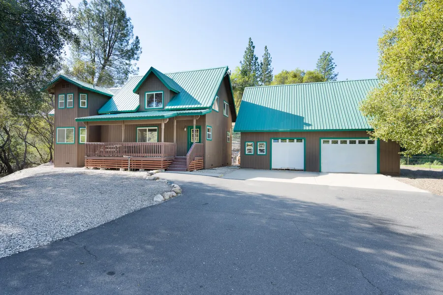 Two homes located on over 54 private acres next to hundreds of acres of BLM land! Take your pick of places to stay. Main cabin is located overlooking your own fully stocked pond. Offering two bedrooms with en-suite baths and a bonus loft area, living room, kitchen and laundry room, this home is move-in ready! An oversized 4 car garage sits next to this home. Take a short drive up the hill to the second home which features panoramic views of the countryside. The first floor has a bathroom, laundry and kitchen, second floor a bedroom/full bath and walk-in closet, and the top level is the living room and deck to enjoy the sweeping views and cool breeze. There's plenty of room for RV parking, round pen for horses, fenced garden area, and out buildings. The entrance to this property is gated to ensure privacy. This is truly a unique parcel that offers some of the most scenic views you'll find anywhere. It's location near Lake Melones and Murphys makes it the ideal country getaway!