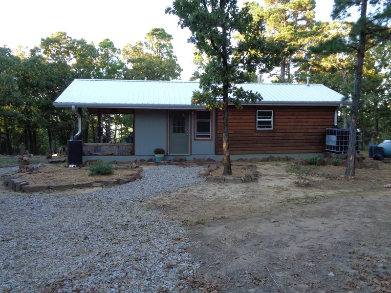 half of this 712 sq ft home. Galvinized steel roof with 600 gallon rain catch system and a functioning well. This property has a 8 x 40 shipping container established as a spacious art studio with 9' ceiling and an attached covered patio that could serve as a guest house.