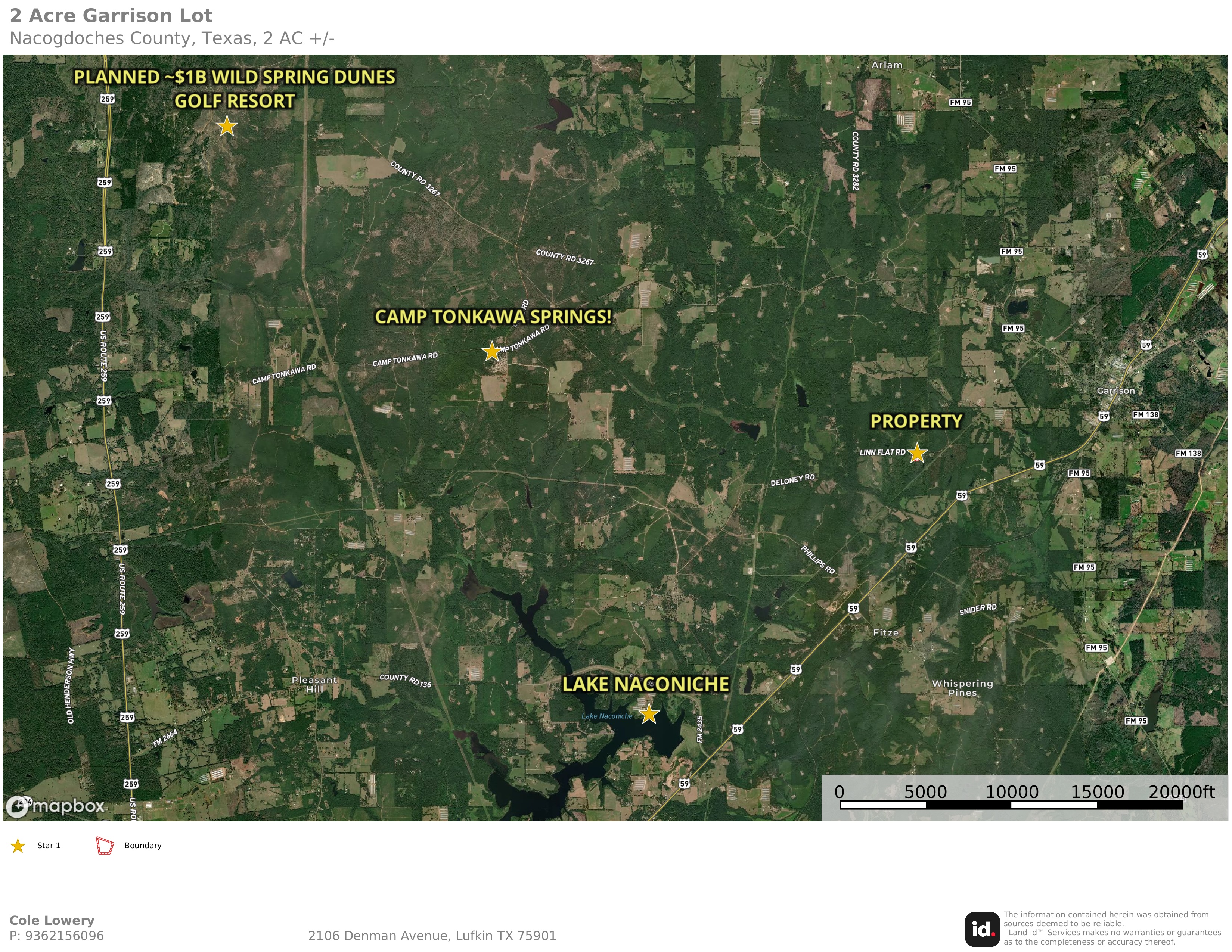 The location in cannot be mentioned enough. Massive parcels are located down Linn Flat Rd and beyond. Because of which, very few vehicles come down this County Road. It is common to go hours and not see a car on the road. This property is located only minutes from Lake Naconiche and Camp Tonkawa Springs & Campground, and only 15 minutes (can get to it entirely from backroads) from the planned ~$1B dollar Wild Spring Dunes Golf Resort. Not only is this property only 2 or 3 minutes from HWY 59 and 5 minutes f...