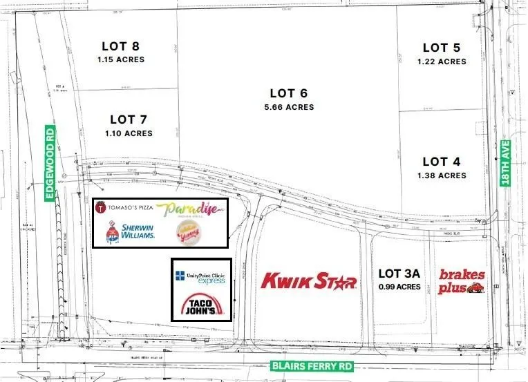 Pecks Landing, a master-planned 18-acre retail power center offers excellent visibility near the northeast quadrant of Cedar Rapids off Blairs Ferry Road and Edgewood Road NE where daily traffic counts exceed 35,000. Pecks Landing is part of a rapidly expanding residential and commercial sub-market surrounded by a variety of business and medical offices, retail, grocery, gas/convenience, service businesses, salons/spas, fitness centers and residential neighborhoods. Edgewood Road NE provides direct connection to major roadways such as Blairs Ferry Road, I-380, and Highway 100/Collins Road extension. A 200,000 square foot Fleet Farm store and active Hy-Vee Grocery in neighboring developments, combined with excellent demographics, produce the areas premium retail and office opportunities. Pecks Landing has an opportunity for commercial land purchase like nothing else in the market. There ...