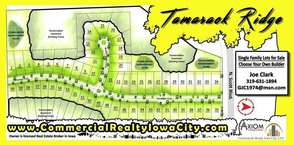 Come live at Tamarack Ridge Subdivision! Iowa City’s finest East Side development!! Enjoy the large single family lots surrounded by well established trees and wild life. Land is just minutes away from Regina High School and City High School. Quick and easy access to Interstate 80 and Downtown Iowa City. Choose your own builder, or use one of the Preferred Builders for construction of your new home. Call Joe Clark today at (319) 631-1894 for more information.