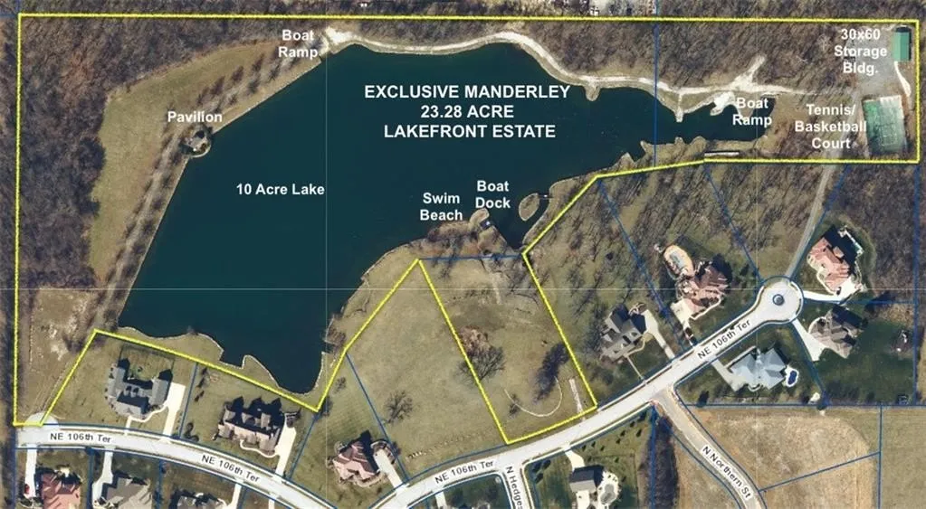 We saved the best for last and this is by far the most beautiful lakefront estate available for your dream home! At the center of this breathtaking 23-acre estate is a stunning, private 10-acre lake representing a true oasis of serenity and recreation. Endless opportunities for adventure await, including boating, fishing, swimming, and more. Whether you're a thrill seeker or looking to wind down the day with an evening sunset cruise, this property delivers. This slice of paradise offers an unparalleled blend of natural beauty and resort-style amenities. Surrounded by picturesque woodlands, this property boasts a private tennis/basketball court, a 30x60 metal storage building for your boats and toys, two convenient boat ramps, a pristine swim beach, and an outdoor pavilion. This prime Kansas City Northland location is close to all city amenities, offers convenient access to I-35, I-435, and 291 highways, and is only minutes to KCI airport and downtown Kansas City. Don't miss this opportunity to own a one-of-a-kind retreat where every day feels like a vacation. Come on home to Manderley and discover the ultimate in private, luxury lake living!