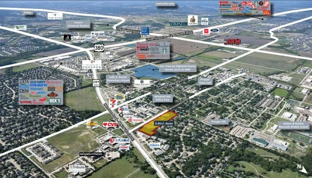 Vanguard Real Estate Advisors (“VREA”) is pleased to present investors and developers the opportunity to acquire 5.45+- acres located along East Broadway Street in the rapidly growing City of Prosper, TX (the “Site”). The Site is positioned along East Broadway Street, and approximately 200 feet west of Preston Road, one of the towns major thoroughfares and commercial corridors. Through PD-118, the Site is zoned for both office and retail uses. Easy access to US-380 and the Dallas North Tollway further enhances regional connectivity, making the Site well-suited for a wide range of commercial uses. This Site is being offered at an attractive price of $22 per square foot for the whole property and $25 per square foot if a purchaser would like to buy a 1-2+- acre pad site out of the overall offering.