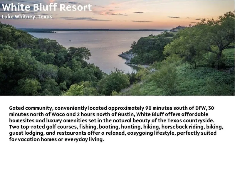 Come build your dream home on this 1.57-acre lot in the front, equestrian portion of White Bluff. This is a quiet, peaceful neighborhood with just a short drive to the water on beautiful Lake Whitney. Enjoy all of the amenities White Bluff has to offer including 36 holes of Championship golfing, tennis courts, marina, pickleball, restaurants and much more! Relax and take in all the wildlife and visit the Lighthouse Pub and watch the sun set on our beautiful lake.