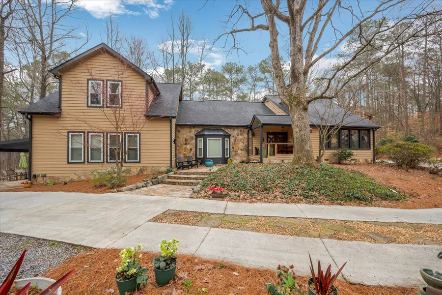 Welcome to the unparalleled charm of 4632 Jefferson Township Lane, a truly unique private estate in East Cobb Situated on 2.10 acres with an additional one-acre natural easement, this home offers an elevated and wooded backyard with breathtaking creek views. The illuminated 450-foot driveway leads to a carport, while the interior boasts a spacious living room with vaulted ceilings, a gourmet kitchen with a 9.5-foot granite island, and a screened porch with access from the kitchen – creating a seamless blend of indoor and outdoor living. The second floor features a master bedroom with skylights, three additional bedrooms, and a study hall, all within the excellent school district of Garrison Mill Elementary, Mabry Middle, and Lassiter High School.