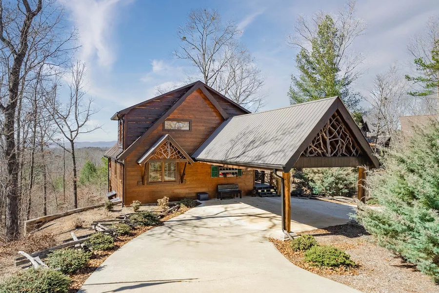 First time on the market! This striking prow-front cabin captures the essence of mountain living, offering year-round, long-range mountain views from nearly every window. Thoughtfully designed with a perfect blend of rustic charm and modern comfort, the home features log accents, custom finishes and upscale touches throughout. Each of the three levels includes its own bedroom and bathroom, plus a built-in bunk nook on the terrace level—ideal for guests or kids. The spacious kitchen boasts a large pantry, handcrafted cabinetry and sleek appliances. Entertain with ease thanks to the custom wet bar, two cozy gas fireplaces, and a lower-level game room with direct access to the hot tub and fire pit—both positioned to take in the stunning mountain scenery. Enjoy all-paved access, a covered two-car carport, and the convenience of being sold fully furnished and turnkey. Whether you are looking ...