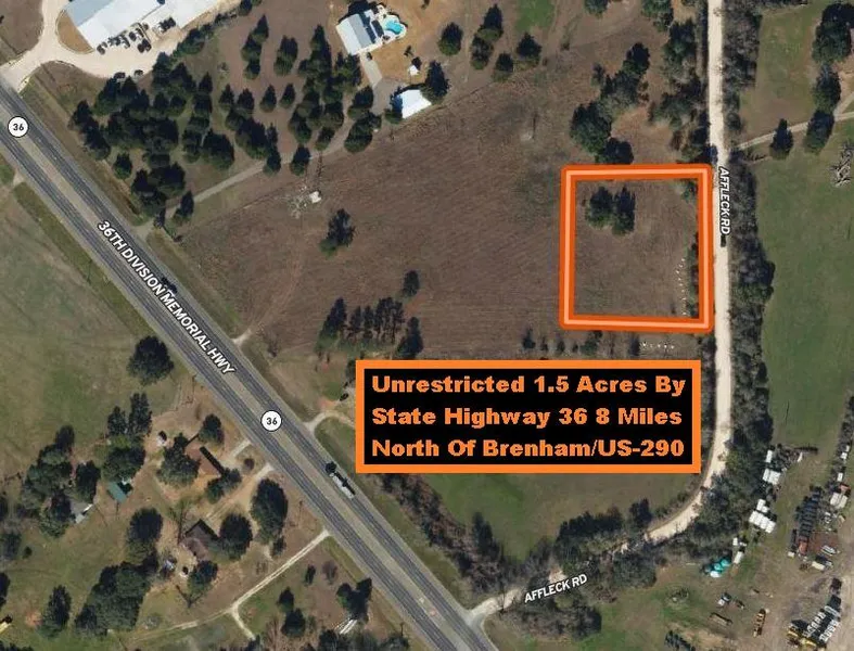 Unrestricted 1.5-Acre Lot By State Highway 36 Just 8 Miles North Of Brenham & US-290. The Property Has 275 Feet Of Road Frontage On Affleck Road. Perfect For Residential, Manufactured Home, Or Business Use. No Water Or Sewer Is Available. The Buyer Will Need To Install A Well & Septic System. 30 Miles South Of Easterwood Airport In Bryan/College Station. Centrally Located Between Houston (75 Miles Away) & Austin (95 Miles Away). Additional Acreage Up To 12.365 Acres With Commercial Frontage On Hwy 36 And A 2,124 SqFt 3/2 Home Also Available For Sale That Can Be Subdivided (See Pics). Call for Details.