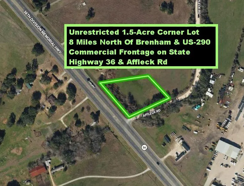 Excellent Opportunity To Own Unrestricted 1.5-Acre Corner Lot In A Great Location On State Highway 36 & Affleck Road Just 8 Miles North Of Brenham & US-290. The Property Has 286.39 Feet Of Commercial Road Frontage On State Hwy 36 And 271.76 Feet Of Road Frontage On Affleck Road. Can Be Used For Residential Or Office/Retail Commercial. TxDot shows an AADT of 11,815 just past Brenham South of the Property & an AADT of 10,020 near FM 390 North of the Property. 400a Electrical Service & High-Speed Microwave Internet Nearby. No Water Or Sewer Available. Buyer Needs To Install Well & Septic. Located 30 Miles South Of Easterwood Airport In Bryan/College Station. Centrally Located Between Houston (75 Miles Away) & Austin (95 Miles Away). Additional Acreage Up to 12.365 Acres With A 2124 Sq Ft 3/2 Home Is Also Available For Sale (Call For Details).