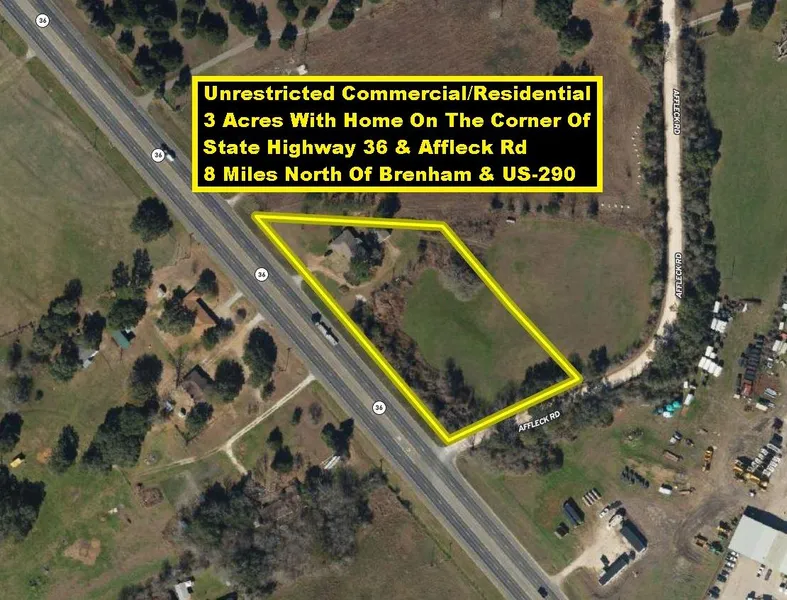 Perfect Opportunity to Own Unrestricted Commercial/Residential 3 Acres With A 2124 Sq Ft Home In A Great Location On The Corner of State Highway 36 & Affleck Rd. Just 8 Miles North Of Brenham & US-290, The Property Has 570.69 Feet of Road Frontage on State Hwy 36 & 271.76 Feet Of Road Frontage On Affleck Road. The 1-Story Home Has A Well, Septic, 3 Bedrooms, 2 Bathrooms, 2-Car Detached Garage, Kitchen With Breakfast Area, Living/Dining Room Combo, and Large Multipurpose Room. The Home Can Be Used For Residential Or Converted Into Office/Retail Commercial. TxDot shows an AADT of 11,815 just past Brenham South of the Property & an AADT of 10,020 near FM 390 North of the Property. 400a Electrical Service& High-Speed Microwave Internet Nearby. Located 30 Miles South Of Easterwood Airport In Bryan/College Station. Centrally Located Between Houston (75 Miles Away) & Austin (95 Miles Away). Can Be Subdivided. Additional Acreage Up to 12.365 Acres Is Also Available For Sale (Call For Details).