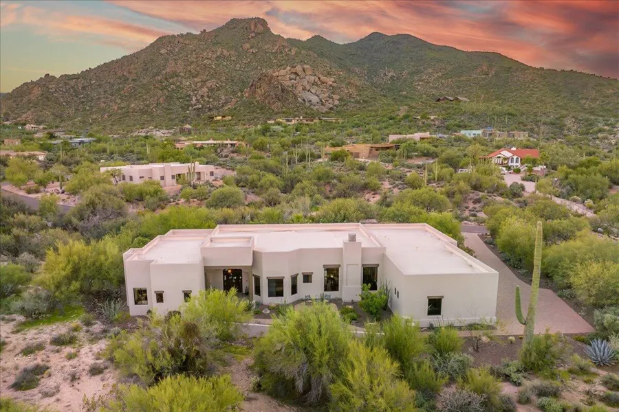 Carefree has a relaxed, upscale desert lifestyle characterized by scenic views,natural rock formations, desert vegetation, and a focus on outdoor living. Thoughtfully designed with high-end finishes custom lighting & smart home technology & 8' alder doors. This home offers a spacious split floor plan with elegant travertine floors and abundant natural light throughout. The chef's kitchen opens seamlessly to expansive living areas, creating the perfect setting for both entertaining and everyday living. Step outside to a resort-style backyard featuring a covered patio w/ misting system, infrared heaters, sparkling SW pool accented by custom water features & Travertine pavers creating a true oasis, outdoor fireplace, built-in BBQ, & lush landscaping with mature Saguaros & perfect Black Mtn View The extended 3-car garage boasts soaring ceilings with ample room to stack and showcase your most prized plete with storage cabinets and epoxied floor. A true desert retreat, this home blends sophistication, comfort, and timeless beauty in one of Carefree's most desirable settings.