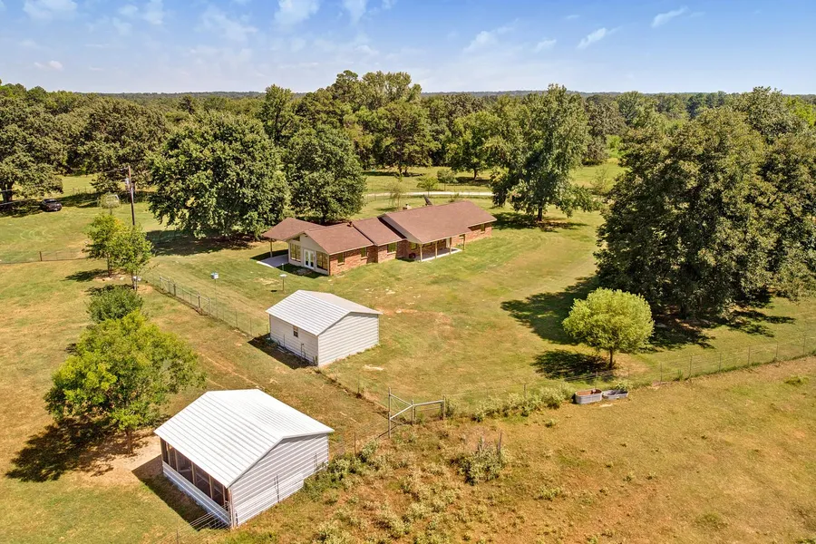 This unique property has it all! Great peace & quiet with beautiful views behind new entrance gate. 2 barns (36x28, 26x16), 12 ind. paddocks fenced for horses-cattle each with water source, tack room,2 ponds, creek, timber, rolling terrain. Bake a pecan pie from your own Pecan trees or enjoy the shade under one of the Oak tress. You'll also have room to grow veggies in the fenced garden spot with water, gather eggs from your chickens in large chicken coop, or feed deer at the feeding pen to include secluded timber for wildlife. Pasture is Bermuda-Bahia-native mix. The long drive is bordered with beautiful trees (water system). The updated home has a a gourmet kitchen with granite, deep sink ex-large island & tons of storage. Three livings areas includes a formal living, a den, and a spacious family-game room is perfect for entertaining in the open floor plan. Gorgeous floors and ceiling fans throughout. Ceramic floors and elegant touches in both full baths. Outside you'll find a covered patio, front porch, new roof in 2019, large fenced yard, and more. All this is move-in ready!