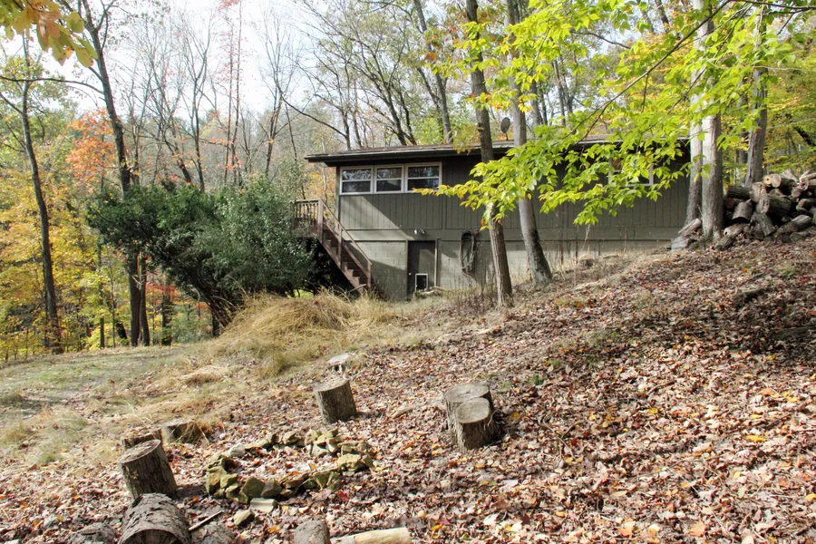 (SOLD - January 2018 - quickly received offer!) Great recent makeovers include addition of central HVAC, windows and door, refinished original pine flooring, newer paint & stain inside and out, wood trim, wiring, insulation and drywall! And most furnishings stay in this classic rustic cabin nestled among fabulous woodland atmosphere. Open kitchen w/breakfast bar perfect for enjoying that morning meal while viewing enchanting nature views. Relax on the deck, listening to birds,watching deer & embracing the sunshine. Family & friends play games,sip lemonade or tea,watch movies,listen to music & enjoy snacks in the great outdoors or in the great room while the woodburning stove with stone wall surround keeps them all cozy and warm. Easy care, freshly painted, charming 3 bedroom, 1 bath classic cabin can quickly become yours, at a great price! Newer roof, spacious deck, lots of windows, wood floors, refrigerator and range, ceiling fans, plus walkout mostly unfinished partial lower w/laundry area & roughed-in 2nd bath w/ shower. See hideawayhillsclub website for full community information.