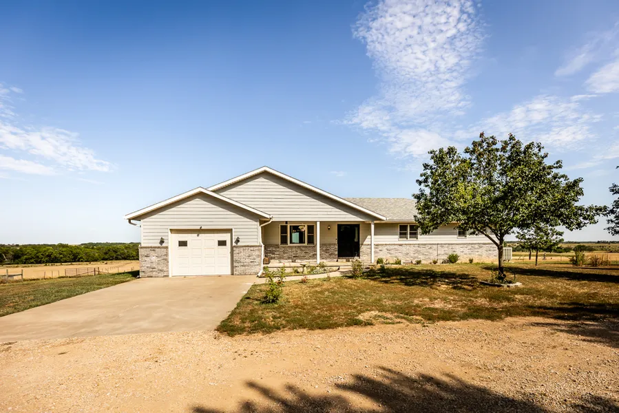 This reverse ranch-style house sits on 45 +/- acres just outside of Eureka, Kansas. Built in 2003, it boasts 3 bedrooms and 3 bathrooms with 1 office/bonus room and over 3,504 square feet. It has recently had many updates including new interior doors, new exterior front and sliding doors, new flooring and trim throughout, along with updates to the kitchen, laundry, and bathrooms. It has an open-concept main floor with a large deck and a walkout basement. The basement has a massive family/rec room, ample storage, and a concrete safe room. The house has a one-car attached garage with an oversized garage door. Utilities to the house include electric, rural water, and high-speed internet. There is also a new 15kW solar system, and the house has a wired transfer switch for a backup generator.