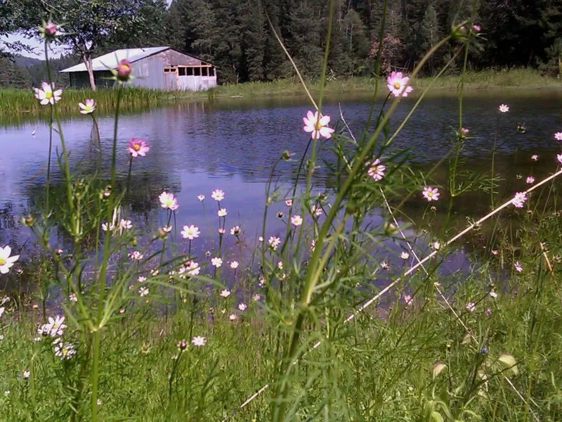 Existing improvements include a cabin, outbuildings, fencing and a pond which is fed by a spring located above the cabin on National Forest land. The spring is permitted for 3 acre feet annually and is piped down to the cabin and pond. Two of the outbuildings are beautifully rustic with a barn constructed of timbers and another barn/horse stall built of logs with wooden fence.