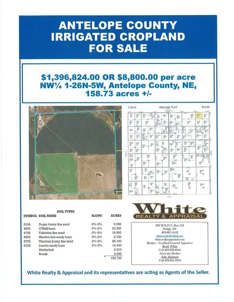 This quarter is located in east central Antelope County, adjacent to Pierce County, Nebraska, and is accessed by county maintained gravel roads. This property has been partially developed for center pivot irrigation, and the center pivot makes 3/4 of a circle. Water is provided by a well located near the center of the quarter. The 320', 850 GPM well, constructed in 1982, irrigates approximately 103.34 acres of cropland. There is a 7 tower Zimmatic center pivot and a 4 cylinder turbo charged John Deere Power Unit in good working order. Manure was spread in the spring of 2025. 2024 soil gridding reveals a $20.00/acre MAP spread. The SE1/4NW1/4 is comprised of quality pasture with a spring fed stock pond. The pasture has a carrying capacity of 25 cow/calf pairs. There is a 2022, 250', 45 GPM stock well in the NW1/4NW1/4 that supplies water to drinkers in the northeast, northwest and southwest corners. The fencing is in good repair, providing ideal feedlots for cattle. Real estate taxes for 2024 are $4042.44. Possession for the 2026 crop year.
