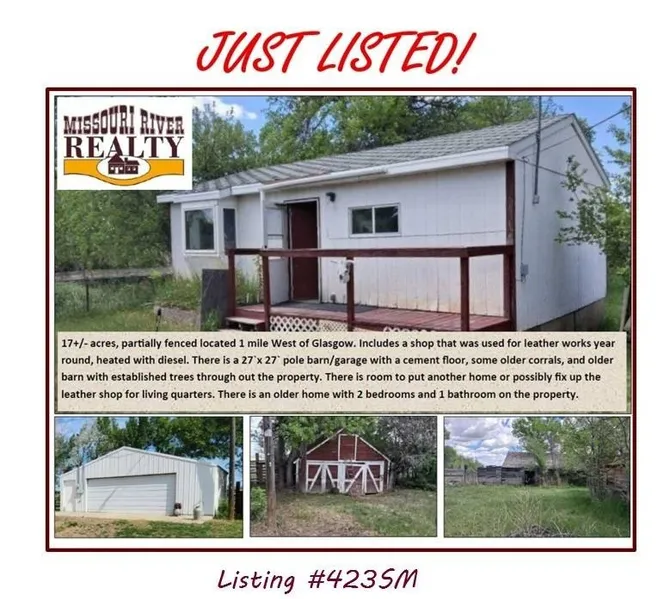 Listing #423SM 17+/- acres, partially fenced located 1 mile West of Glasgow. Includes a shop that was used for leather works year round, heated with diesel. There is a 27`x 27` pole barn/garage with a cement floor, some older corrals, and older barn with established trees through out the property. There is room to put another home or possibly fix up the leather shop for living quarters. There is an older home with 2 bedrooms and 1 bathroom on the property.