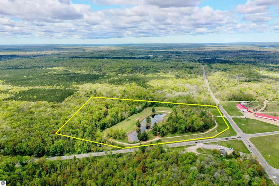25 acres located on the highly visible and busy corner of M-55 and M-37 in Wellston, MI that adjoins thousands of acres of National Forest Land and adjacent to Trail 6 that is popular for snowmobiling and ORVs. A portion of the property is heavily wooded with gorgeous hilltop views that overlook a park-like setting with a private pond. There are endless development possibilities for this property. There has been a site plan partially completed for a 46-site RV Park that is available to view upon request, but again, that is just one possibility. Manistee is approximately 30 miles to the west, and Cadillac is 25 miles to the east and the beautiful ski hills and golf course of Caberfae are just a few miles up the road. Please make an appointment to view and aerial property lines are approximate. Property is zoned Commercial.