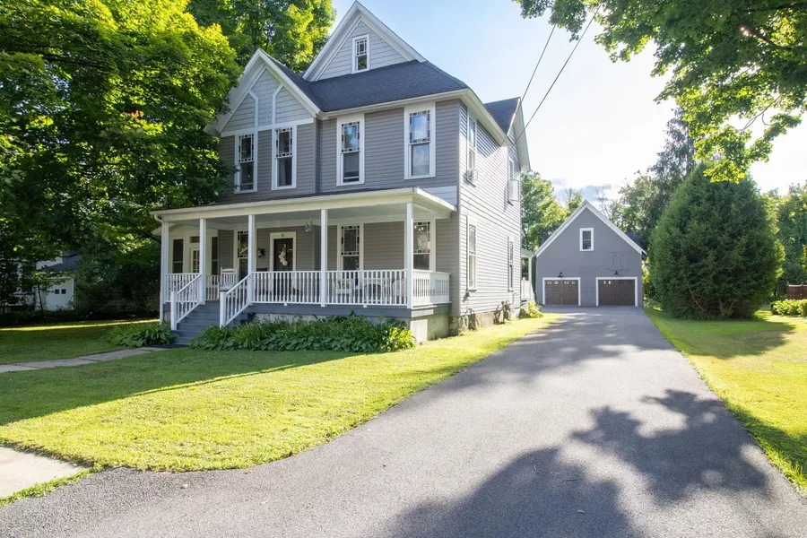 Don't miss the opportunity to own this lovely Victorian style home offering just over 3,000 sq. ft. of living space with nearly 10' ceilings that offers the perfect blend of timeless charm and modern luxury. Conveniently located just steps from downtown Canton and schools, this home features 4 spacious bedrooms, 3 and half bathrooms and stunning floor to ceiling windows with original stain glass accents. The first floor boasts a chef-style gourmet kitchen with all the major stainless-steel appliances highlighting a farm style hammered copper sink with an additional island prep sink. Grand in size, the kitchen island features granite stone with ample seating up to 6-7 guests. The first-floor design includes a formal dining room, a double living room, a half bathroom with shared laundry room space and a three-season enclosed porch-- the ideal space for enjoying morning coffee or an evening of relaxation. Beautiful hardwood flooring throughout with custom 7" baseboard trim giving a vintage feel. The second floor features a primary bedroom suite with a walk-in ceramic tile shower and a double sink vanity as well as three additional bedrooms and two full bathrooms. Accessible from the second story is a partially finished walk up attic with plenty of storage. This home offers a paved driveway that leads to a restored carriage barn with automatic garage door openers for two parking spaces and offers additional storage options. Call today to set up your tour of this storybook Canton village home!