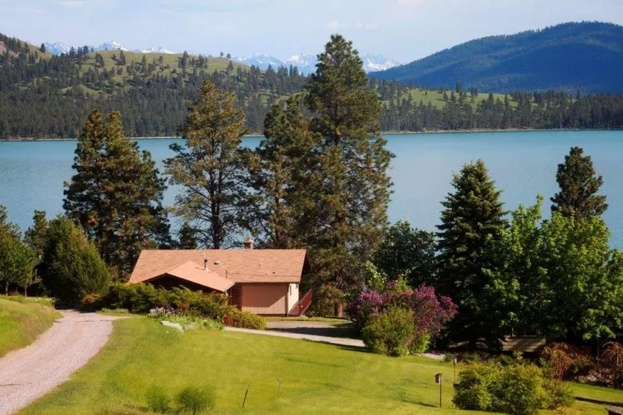 Views of Wild Horse Island from this Flathead Lake retreat. Over one acre with 100 of lake frontage. A gentle slope leads to a boat house and beachfront with fire pit. The covered deck above and patio below offer beautiful lake and mountain views. Mature trees, lilac hedge and landscaping round out the yard. The comfortable home has 3 Native Rock fireplaces, a main level master suite with views of the lake, and a living room with lake views that leads to the covered deck. The walk out lower level is the perfect guest area with a kitchenette, family room, fireplace, bath and 2 bedrooms. A great family get-away or full time residence. The enclosed boat house has a winch, sits directly on the lake and comes with a boat.