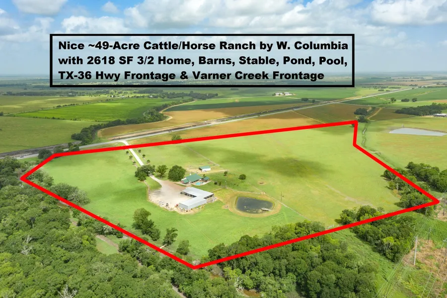 Nice ~49-Acre Cattle/Horse Ranch by W. Columbia with custom stone 3/2 Home, Barns, Stable, Pond, ~262 Ft TX-36 Hwy Frontage & ~1372 Ft Varner Creek Frontage. Fully fenced & cross fenced. 2 Water Wells: 1 for home/barns/stable & 1 for pond behind barn. 2618 SF Home has standing seam metal roof; Office/Study can be 4th Bedroom; Kitchen/Living/Dining Area has engineered wood floors, vaulted ceiling & stone fireplace; Kitchen has cooktop island w/breakfast bar; Covered front porch overlooks large oaks; Covered back porch overlooks pool, heated spa & 572 SF canopy w/vaulted wood ceiling & fire pit. Utility Rm has access to 2-Car Carport & Primary Bedroom. 1600 SF Stable has a/c tack room. 3200 SF & 5668 SF Barns w/half bath are by Home. Property is Also Listed For Sale as 101+ Acres, which includes an Additional 51+ Acres, CR 23 Road Frontage, Stock Pond, 5100 SF Covered Pens, ~500 SF Building & Gates on CR 23 (see Pic)!