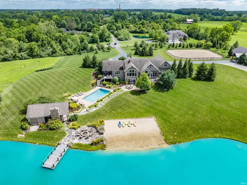 *Stunning Equestrian Estate on 21 Private Acres* This one-of-a-kind spectacular estate, meticulously crafted by renowned builder Stu Berk and featured in Fort Wayne Magazine, is nestled on 21+ completely private acres and offers the ultimate retreat for nature lovers and discerning buyers seeking unmatched amenities and design. From the moment you arrive, the estate's grandeur is evident—rolling pastures, wooded trails, a pristine private pond w/ sandy beach & pier, heated pool & pool house, & a swanky horse barn that sets a new standard. The heart of the property is a walk-out 4 BR, 5 BA, 6,954 sq/ft ranch-style home infused with natural light & boasting panoramic views. Interior features include wide plank hardwoods, slate floors, exposed repurposed beams, natural stone accents, open-concept floor plan, soaring ceilings, & luxe finishes. The eat-in kitchen is a chef’s dream, complete with granite counters, a multi-tiered island, paneled appliances, a separate Zip Hydrotap water system, and a statement AGA stove. The main-level primary suite is a luxurious haven w/ two oversized walk-in closets, a freestanding tub, walk-in tiled & steam shower, heated floors, dual vanity, gas fireplace, & private balcony access with hot tub & views galore. A private office connects directly to the suite, while a large screened porch, mudroom with custom lockers, second office/laundry, walk-up floored attic, & attached 4-car garage complete the main level. Downstairs, the lower level offers three en-suite bedrooms, each w/ walk-in closets. Additional spaces include a large family room w/ gas fireplace and stone hearth, full wet bar w/ appliances, separate laundry, workout room, concrete safe room, & built-ins—plus a walk-up to the garage & separate workshop for convenience. Outdoors, your private resort oasis awaits. Enjoy the stone & timber pool house, complete w/ a wood-fired pizza oven, wood-burning fireplace, granite outdoor kitchen w/ built-in grill, half bath, & attached garage. The equestrian barn is truly exceptional, featuring 4 indoor/outdoor stalls (expandable to 12), steel accents, Buckley equestrian fencing, a cedar full bath, wash bays, a 2-story hayloft, & fenced-in horse arena—ideal for boarding or training at a professional level.