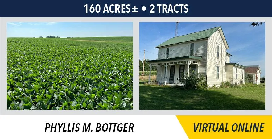 The Phyllis M. Bottger farm will be sold on a price per acre basis, based upon a survey currently in progress. Surveyed acres will be used to constitute the final settlement price. Both tracts will be offered through the marketing method of Buyers Choice, whereas the high bidder can elect either or both tracts for their high bid. If the high bidder does not elect both tracts, then the remaining tract will be sold. The tracts will NOT be offered in their entirety at the conclusion of the auction.