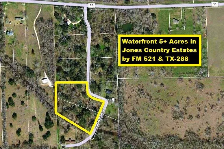 Waterfront 5+ Acres w/Majestic Oak & Pecan Trees in Beautiful Jones Country Estates by FM 521 & TX-288. Stocked pond that runs 400 ft along the South border is visited by deer & is great for catching catfish & bowfish. Restrictions allow poultry, but not other livestock or horses. Culvert set in place for Driveway. Well & Septic will need to be installed! Low Taxes! 20 mi to Lake Jackson, 30 mi to Freeport & 40 mi to TX Medical Center & Downtown Houston. Call for Lenders! Additional acreage available!