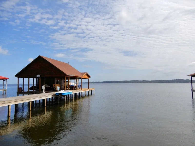 Let Lake Palestine, in the hills & trees of East Texas, bring you to the lake life you deserve! Located just off the main highway between Tyler TX & Palestine TX, you can build your custom luxury waterfront home on this Lake Palestine lot with water & electricity on-site for ease of building, plus RV hookup! This east facing lot is .288 acre terraced with Centipede Bermuda grass, sprinkler system, concrete driveway down to the water, a concrete-capped bulkhead & a boathouse with two electric lifts, plus heated & cooled living space to come in and relax after playing on the lake all day! The two-story boathouse has a refreshment area downstairs, cedar walls, 2 air conditioners, and relaxing space upstairs via the spiral staircase. Incredible & rare 8-9' water depth! Only 90 minutes from Dallas & 3.5 hours from Houston, make your escape to the lake today!