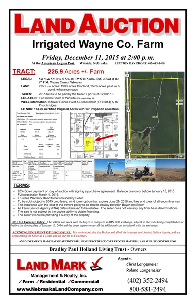 Offered at Public Auction December 11, 2015 at 2:00 pm at the American Legion Post, Winside, NE
