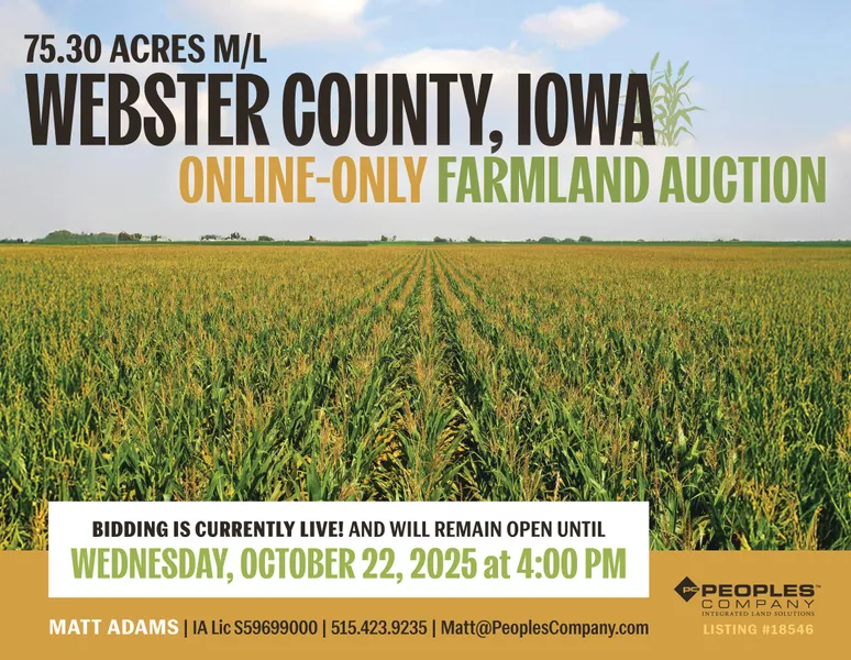Offering Webster County, Iowa farmland through a TIMED ONLINE ONLY auction where all bidding must be done online through Peoples Company's bidding application. Bidding is currently LIVE and will remain open until Wednesday, October 22nd, 2025, at 4:00 PM Central Time Zone (CST) with closing taking place on or before Tuesday, December 9th, 2025. A bid placed within 3 minutes of the scheduled close of the auction will extend bidding by 3 minutes until all the bidding is completed. If you plan to bid, please register 24 hours prior to the close of the auction for approval to bid. The Seller has the right to accept or reject any and all bids. Under no circumstances shall Bidder have any kind of claim against Peoples Company or its affiliates if the internet service fails to work correctly before or during the auction.