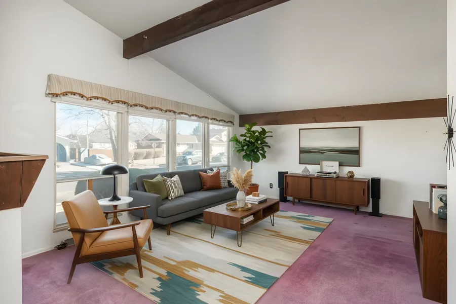 Welcome to this charming tri-level time-capsule home, ideally situated on a large, private lot in sought-after Hampden Heights. Warmth and character are felt the moment you enter, highlighted by a flowing, open mid-century modern–inspired design. Formal living and dining rooms feature vaulted ceilings accented by exposed wood beams, creating an inviting and timeless atmosphere. The retro kitchen is rich in character and opens seamlessly to the dining and living areas, making entertaining effortless.