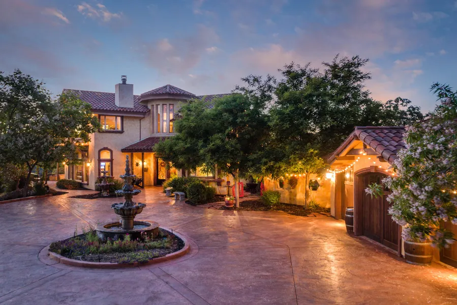 Fall for this 61-acre Sierra Foothill vineyard estate; situated privately above an award-winning vineyard and boasting extraordinary lake and mountain views, this home was designed to capture an abundance of natural light, with floor-to ceiling windows and doors allowing for the enjoyment of expansive views. This estate is, in and of itself, a destination offering an entertainers kitchen with top-of-the-line appliances, home theater, numerous balconies, expansive pool, hillside spa, and enchanting courtyards. An elaborate spiral staircase is the center of the home, adorned with bespoke iron handrails. The property consists of a main home, cabana, winemakers home, guest home and 11-acres of planted grapes, brand, equipment and wine inventory. Its easy to perfect the art of living, when you live within a work of art.