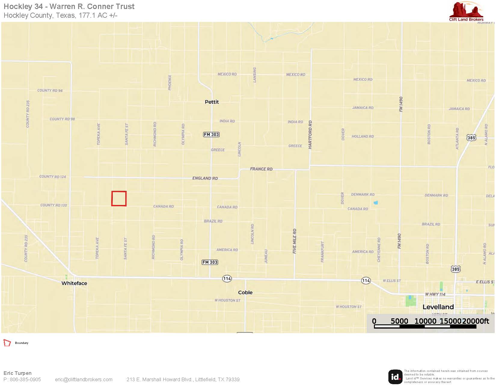 This is a well-maintained dryland farm located north of Whiteface in Hockley County, Texas. The property features paved County Road Santa Fe frontage along the east side and County Road Canda frontage along the south side, providing excellent access.
