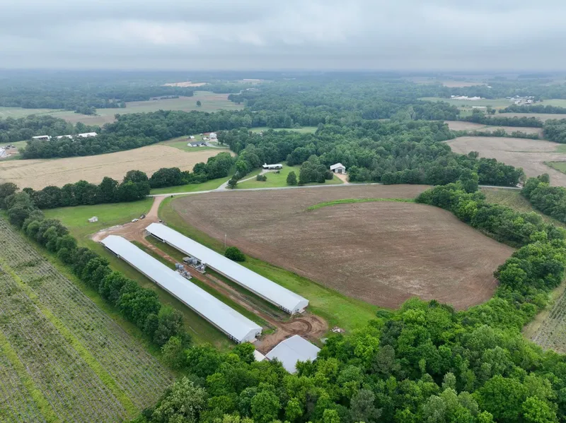 This property offers a unique blend of residential comfort, agricultural production, and recreational potential, making it a strong, income-generating investment. The centerpiece is a two-barn breeder farm, built in 2005 and currently under contract with Pilgrim’s, providing a reliable income stream. The manicured facility includes a gravel drive and parking area, storage barn, equipment shed, and is well maintained for operational efficiency. The tract also features 11+/- tillable acres currently planted in soybeans for the 2025 growing season, offering additional agricultural income. The 1,680 S.F., 3BR, 2BA home includes a spacious living, kitchen, and dining area, along with a master suite, covered front porch, and a back deck overlooking a beautifully landscaped and maintained yard with garden areas. A large shop building with a concrete floor, finished office space, and workshop with electric, heat, and air provides the ideal space for on-site management or storage. The landscape transitions into timbered ridges and draws, featuring a healthy stand of softwoods and mast-producing hardwoods, offering prime deer and turkey hunting opportunities. The property boasts 1,500 feet of frontage along Terrapin Creek, a natural corridor for wildlife, and 1,700 feet of road frontage with multiple entry points for easy access. Whether you're looking for an operational farm, a beautiful country home, or a place to enjoy outdoor recreation, this property offers a well-rounded portfolio of value and potential. Give us a call today and schedule your private tour!