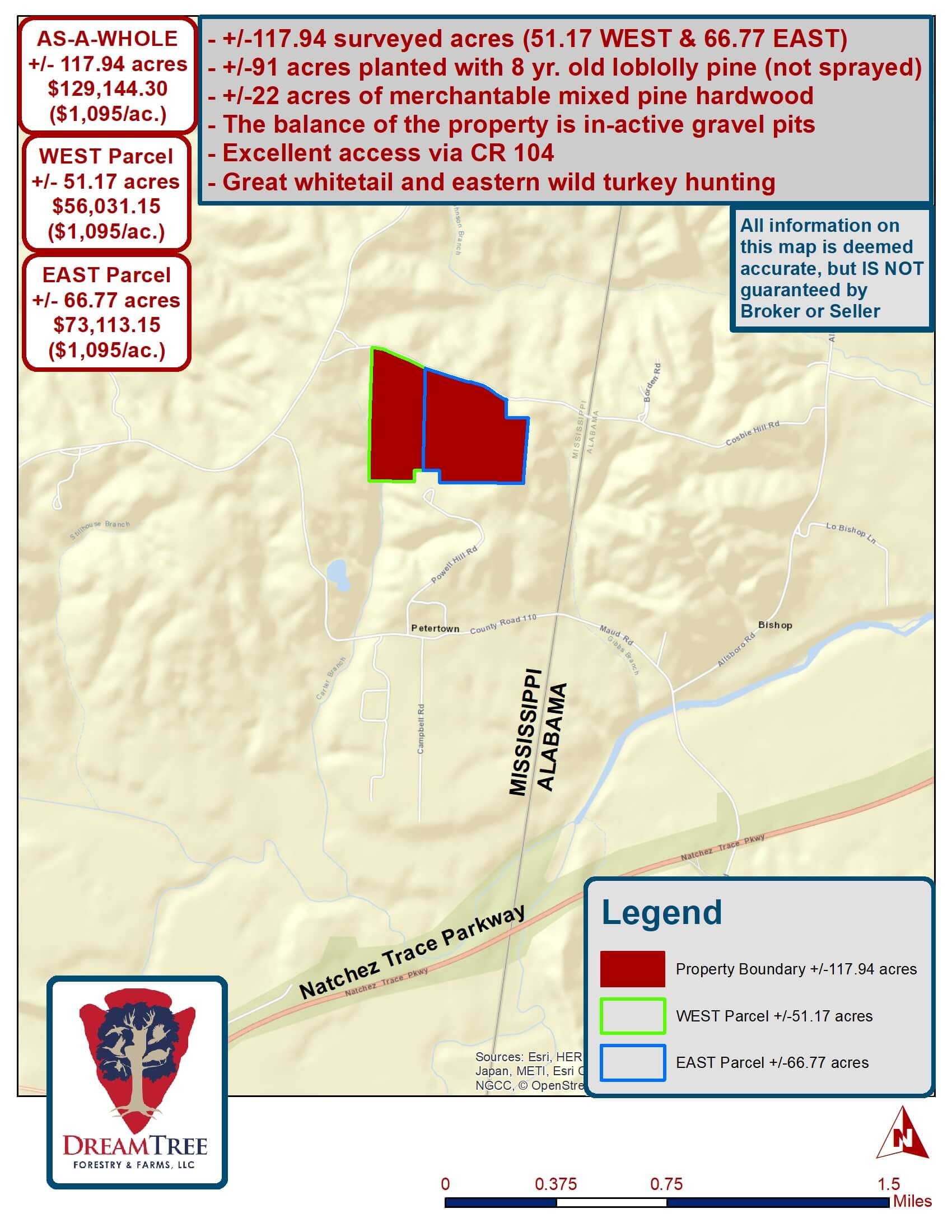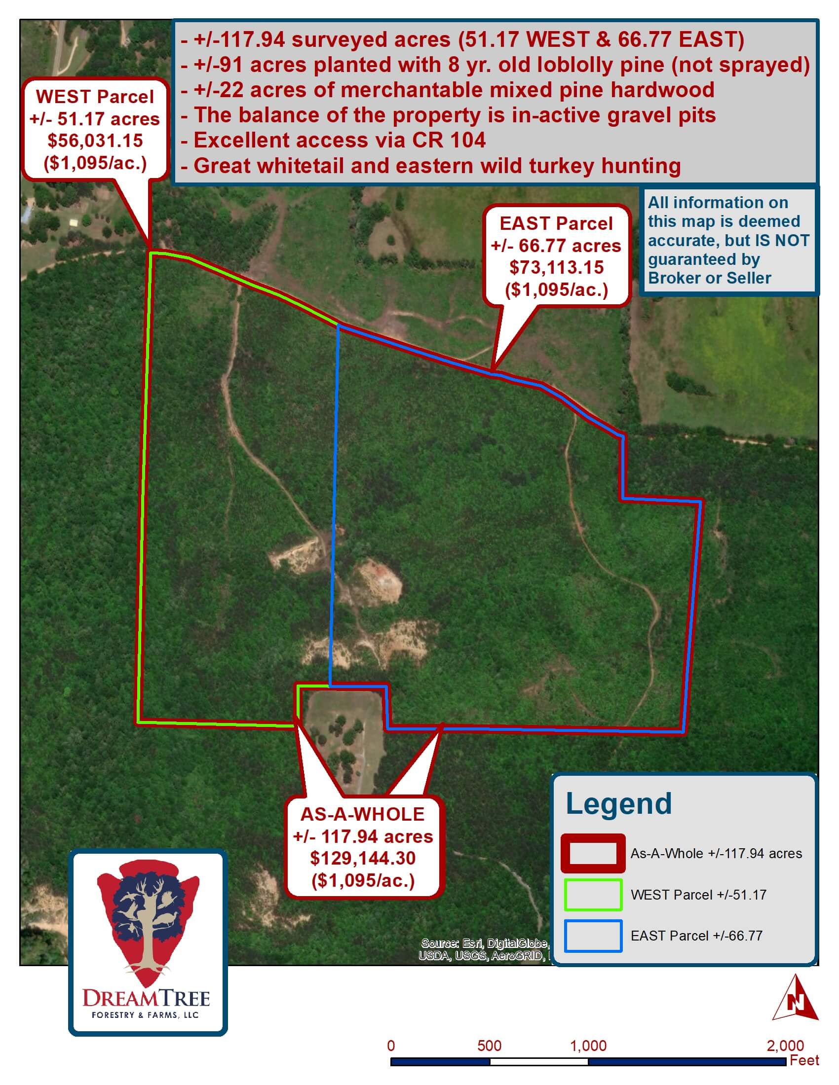 Owner will divide into +/- 51.17 acres & +/- 66.77 acres, or sell as a whole as +/- 117.94 acres. Great, gently rolling timber land. Most of this property could be converted to pasture if desired. Nice potential home sites along abundant county road frontage. +/- 9 year old planted pine (not sprayed) grows on approximately 91 acres of the Subject Property. There is a nice stand of mixed pine & hardwood growing on approximately 22 acres of the Subject Property. The balance of property is gravel pits that could be re-opened. Good hunting for deer & turkey.
