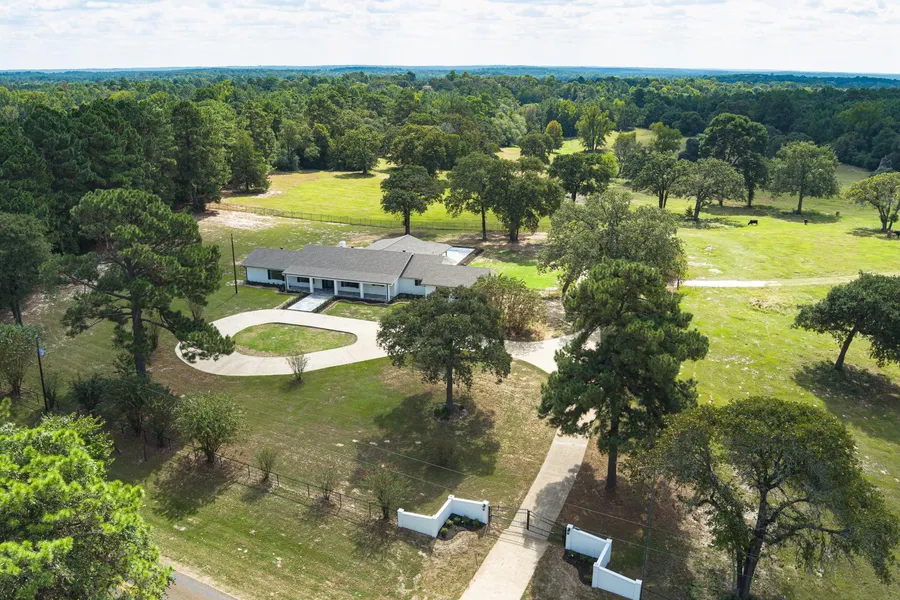 Expect to be impressed with this gorgeous 239-acre estate, just a few miles from downtown Grapeland! From the moment you drive through the gated entry, you will be amazed with the pretty setting surrounded by attractive black pipe fencing and extensive landscaping. This beautiful ranch style home was taken to the studs and completely remodeled. The home has all new high-end products and finishes throughout, and all mechanical, electrical, and plumbing work was performed by licensed contractors. Upon entry of this home, you will love the open concept living, dining, and kitchen. This space boasts large, picture windows to bring the outside in. The living room has a pretty wood-burning fireplace to keep you cozy during the cool months. For the cook in the family, they will fall in love the moment they see the beautiful island kitchen with Calcatta Quartz countertops, custom cabinetry with shaker-style doors, and Frigidaire Pro-Series appliances. Just off this space, you will find a large game-room overlooking the pool and a private bath that serves guest well. The master suite has a custom block panel accent wall, and a sliding barn door leading into the private bath with his and her sinks, and a massive walk-in tile shower. Two guest bedrooms share a Jack and Jill bathroom, while the fourth bedroom has an in-suite bathroom. Throughout the entire home you find beautiful Attro-guard waterproof/scratch resistant flooring and custom trim ranging from shiplap, board and batten wainscotting, crown-molding, and tons of built-ins. Outdoors, you will enjoy swimming in the pool and the views of the 3-acre stocked natural spring fed pond. In addition to the 2-car attached garage, there is also a 3-car garage, and a large, insulated barn with concrete slab capable of turning into living quarters or for equipment storage. This property has a good mix of pastureland and hardwoods. A property this spectacular will be difficult to pass up, so give us a call today to schedule a private tour.