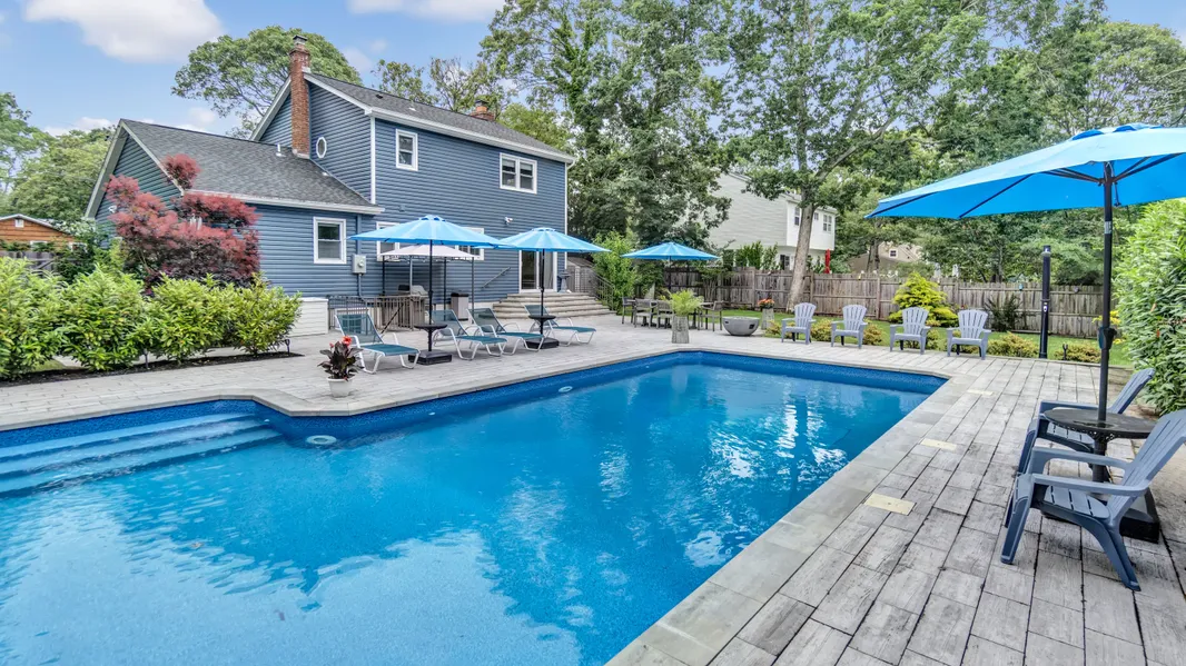 Outdoors, the home becomes a true summer sanctuary. The lushly landscaped and fully fenced backyard is centered around a heated saltwater pool, an expansive paver patio, a refreshing outdoor shower, and generous room for lounging or entertaining in style.