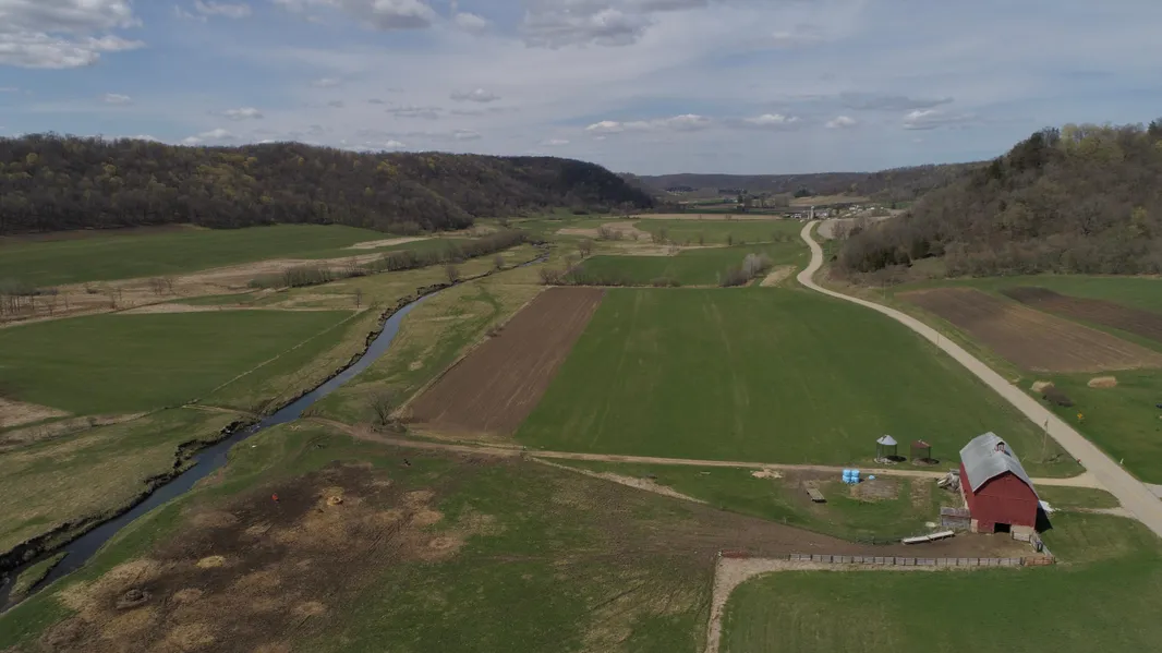 Youll find this masterpiece in the heart of Richland County just north of Boaz off of County Hwy E. A 30x70ft +/- old red barn welcomes guests into a driveway that leads directly into the grounds. One of the first sights youll notice is a large free-flowing waterway running north to south known as Mill Creek, which is a Class 1 Trout Stream. These very waters not only hold some of the best trout fishing in the region, but decorate the property with an inspiring sight to behold with skyscraping bluffs in the background. The fish rich stream runs nearly mile +/- in length along the property providing a year-round water source for animals, plenty of deep trout holes and a relaxing orchestra of constant cascading waters. On the north end of the property theres a small waterfall that only accentuates the beauty.
