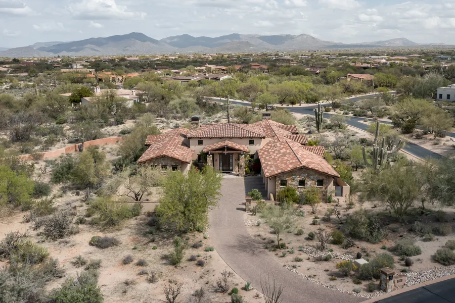 Situated on a private corner lot surrounded by pristine desert landscape, this stunning home is the perfect blend of desert ranch architecture and modern luxury. The open great room features soaring beamed ceilings, reclaimed hardwood floors, and a massive glass wall that effortlessly opens to the backyard. The home boasts two primary bedrooms, each with its own en-suite bathroom, as well as two additional guest rooms and a separate casita that functions as the 5th bedroom. A wet bar, conveniently located in the open great room is perfect for entertaining. The large kitchen is a chef's dream, featuring dual islands, ample counter space, and high-end finishes, ideal for both casual dining and hosting guests. For ultimate outdoor enjoyment, the backyard is centered around the heated pool and spa, an outdoor fire-pit, and a built-in BBQ. The guest house, complete with its own fireplace, off...