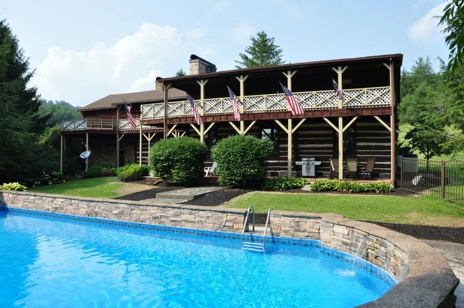This spacious home evokes the feeling of a grand lodge, with broad timbers, natural wood, living and dining areas with 30-foot cathedral ceilings, a stacked stone fireplace with an intricate wood mosaic over the mantel, and numerous other artful touches. Constructed of oak logs, board-and-batten siding, and stone from the nearby Greenbrier River, this is truly a one-of-a-kind property, situated on 3.7 acres in a quiet rural neighborhood just north of White Sulphur Springs. The homes many special features include an attractive backyard swimming pool and pool house surrounded by evergreens and a cherry tree, offering a perfect setting for outdoor entertaining.