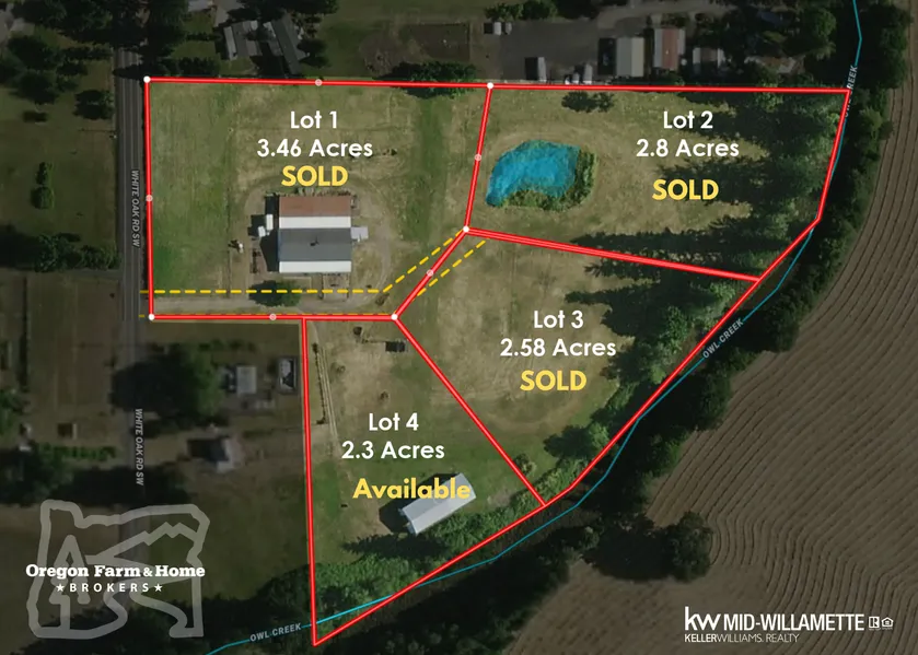 This Owl Creek frontage rural residential buildable 2.5 acre property features a vast 40'x100' hay storage building ready for your ideas. Build your dream home at this quiet country location! Surveyed, septic approval, high-volume well, Class I soils, and water rights. This is 1 of 4 lots for sale. Centrally located between Corvallis and Albany! Buyer due diligence for home replacement.