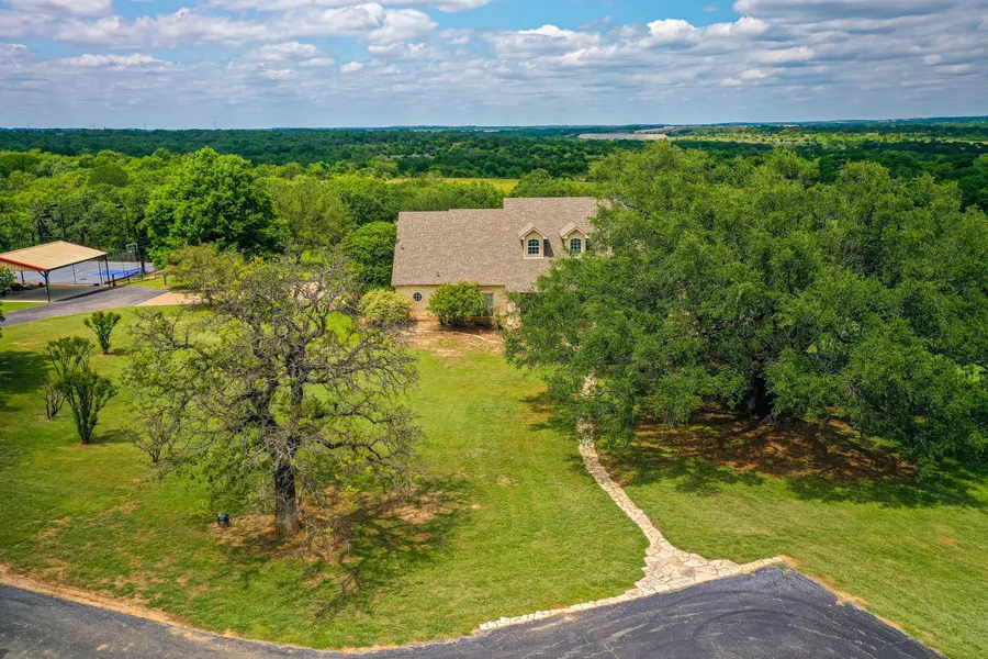 White Rock House at Santana Ridge in Parker County. This 4 acre horse property with hilltop setting and surrounded by huge live oaks offers a spacious 4199 square foot Austin Stone house. The house features 3 bedrooms, 3full baths and a half bath as well as a 3 car garage. There is a very nice stall barn with large center isle and sliding doors on each end, wash rack, feed and hay storage and nice rustic tack room with cedar lined walls. For the workout enthusiast there is a large sized sport court with basketball, tennis and batting cages. House is one story with dramatic roof line that has a Hill Country look surrounded by giant Live Oaks. The home features formal & casual dining, breakfast bar, office, mud room, shop, covered outdoor area, covered porches front and back and endless views.