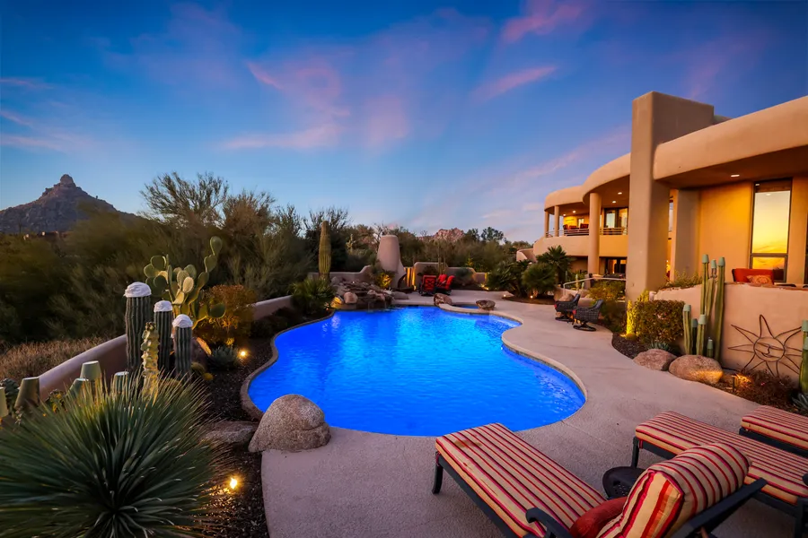Nestled within the exclusive gated community of Windy Walk Estates at Troon Village, this exceptional home offers a rare and sought-after location custom-built by Shiloh Homes and designed by Lee Hutchinson. Situated on the 8th tee box of Troon Country Club's private course, this property boasts breathtaking city light, Pinnacle Peak, and double fairway views from the backyard, while the front showcases the majestic Troon Mountain. The positioning of the home has been thoughtfully designed to provide an idyllic setting for both relaxation and entertainment. The outdoor oasis is a true haven, featuring an elevated covered patio with a charming fire pit, a sparkling pool adorned with a rock waterfall, a rejuvenating spa, and flagstone hardscape that adds a touch of sophistication.